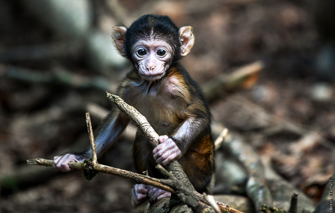 Детеныш магота, родившийся несколько недель назад, в парке для обезьян Аффенберг в Германии