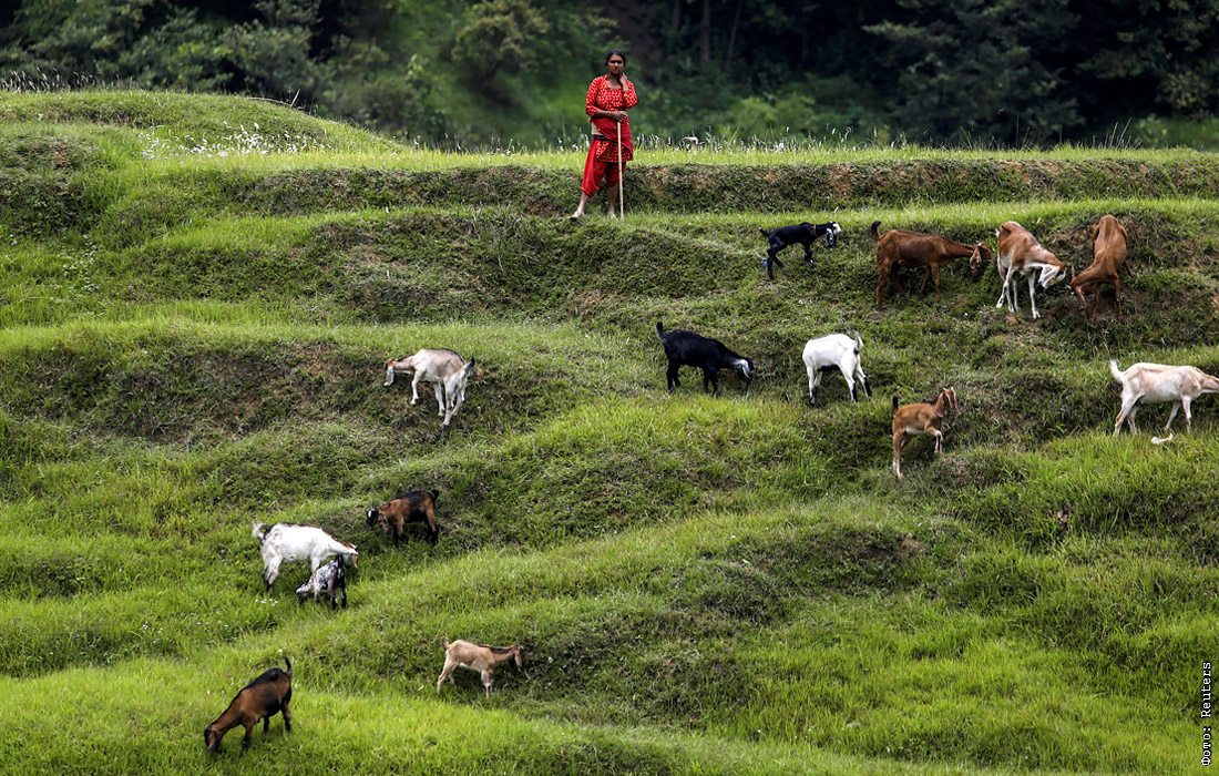 Женщина пасет коз на полях в Бхактапуре, Непал