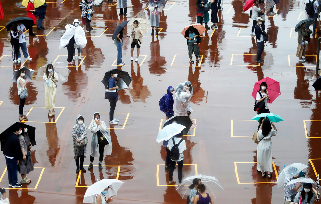 2 июля. В Токио зафиксирован рекордный с момента снятия ЧС прирост новых случаев коронавируса. Общее количество инфицированных составляет около 6,4 тысяч человек. На фото: посетители у входа в Диснейленд, который открылся после четырех месяцев перерыва.