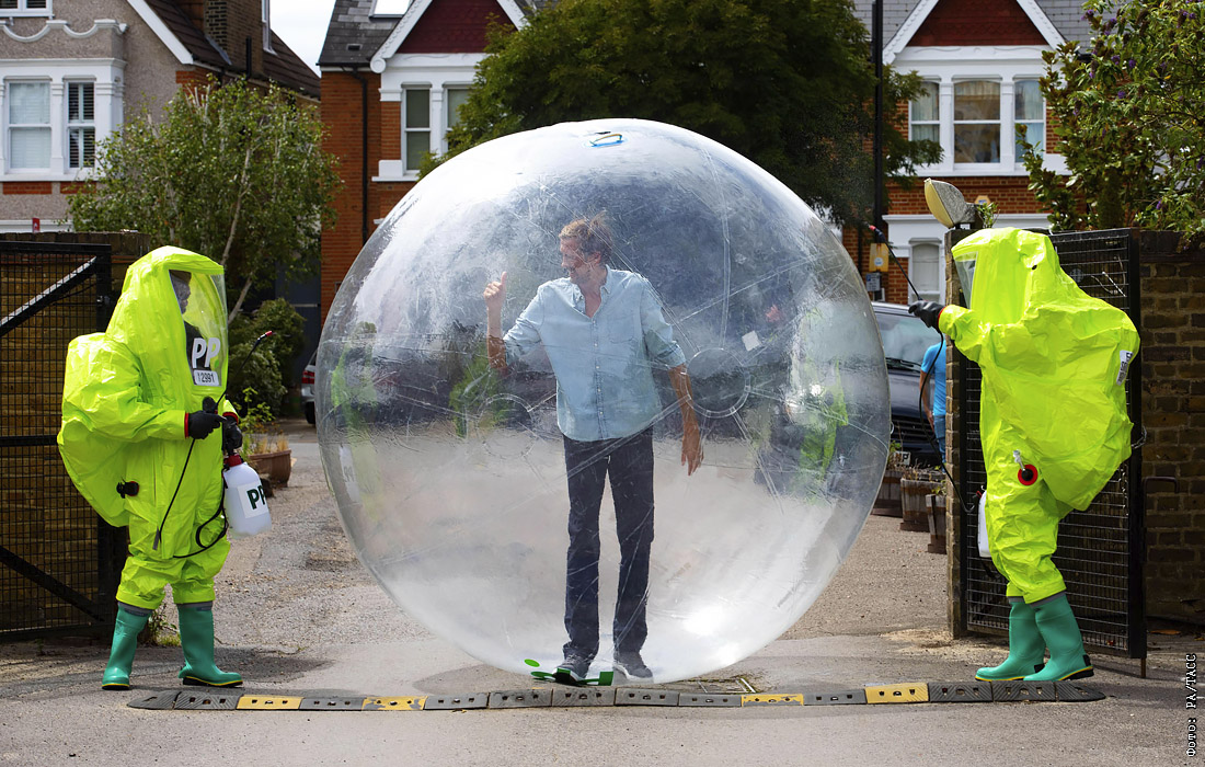21 июля. Великобритания по числу умерших стоит на третьем месте, где с начала пандемии жертвами коронавируса стали более 45 тысяч человек. На фото: экс-форвард сборной Англии Питер Крауч соблюдает социальную дистанцию на съемках рекламы для ирландской букмекерской компании.