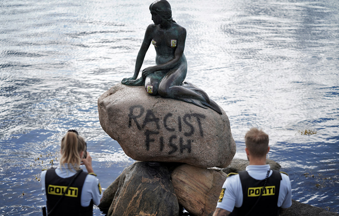Надпись "Расистская рыба" (racist fish) появилась на постаменте статуи Русалочки в Копенгагене. Скульптура многократно становилась объектом вандализма. Ее несколько раз лишали головы, обливали краской, одевали в мусульманские одежды, подрывали, ей отпиливали руку, а также к ней прикрепляли посторонние предметы.
