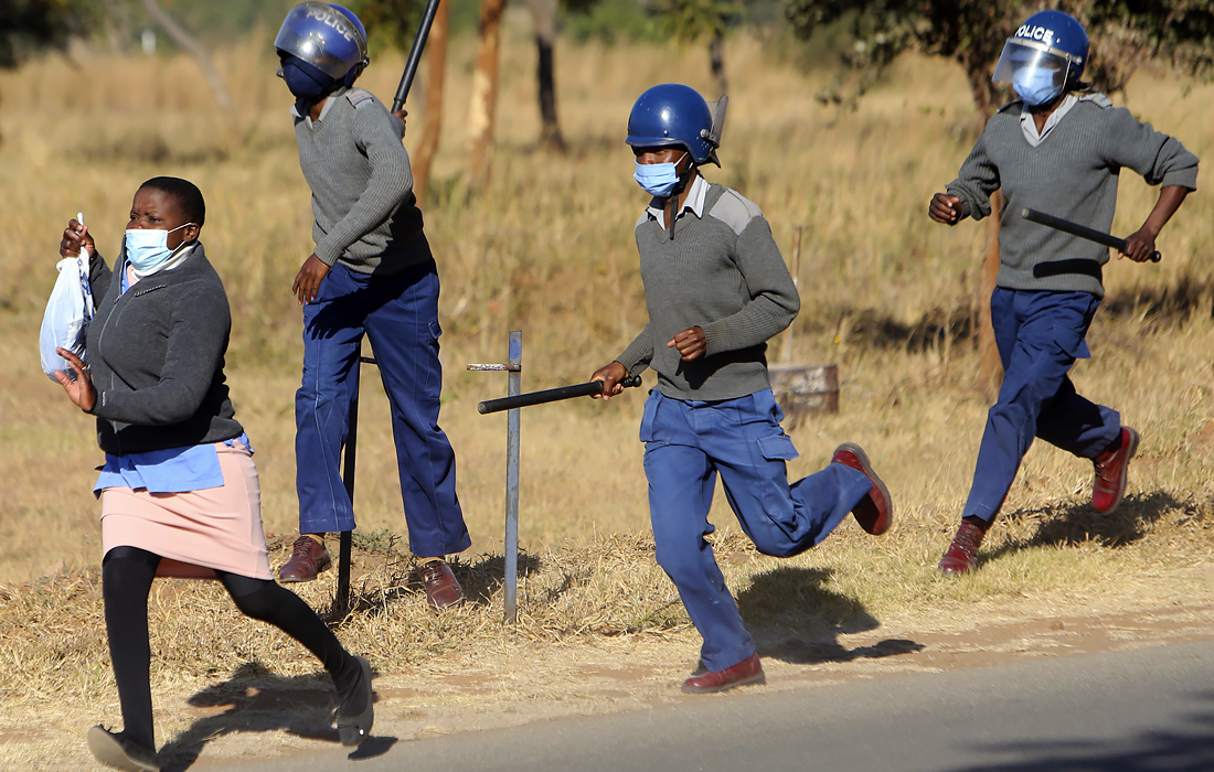 Десятки медсестер собрались на акции протеста в крупнейших госпиталях Зимбабве. На фото: силовики преследуют медсестру, которая протестовала в государственной больнице в столице страны Хараре.