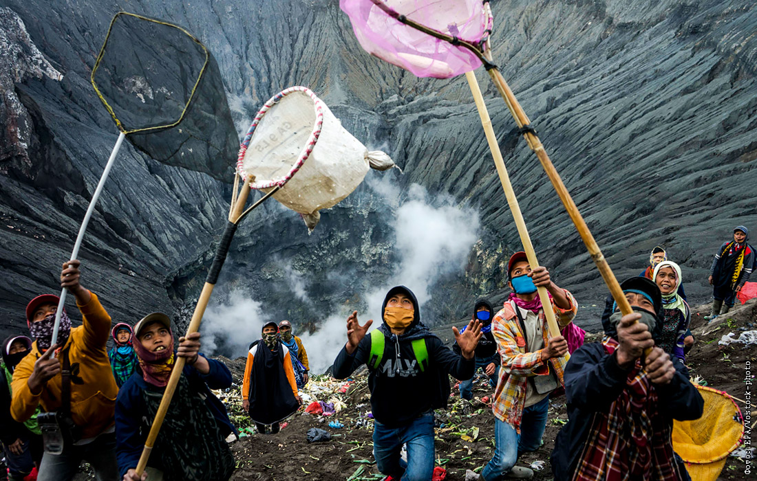 Традиционный фестиваль Ядня Касада проходит на острове Ява в Индонезии. Местные жители бросают в кратер вулкана Бромо подношения в виде риса, фруктов, овощей, цветов и домашнего скота, чтобы получить благословение. В это время другие участники ритуала стоят внутри кратера и пытаются поймать еду, приносимую в жертву вулкану.