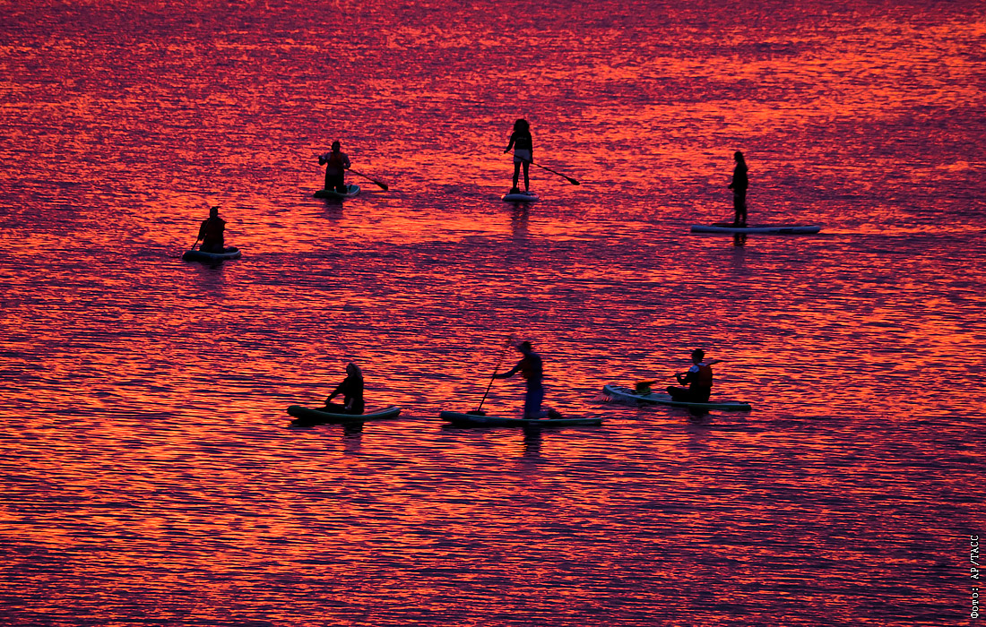 Сапсерферы во время заката на реке Великая в Пскове