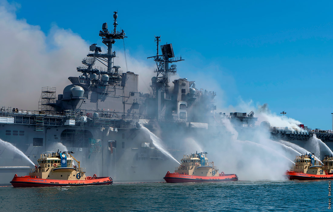 Более 29 часов продолжается пожар на 255-метровом универсальном десантном корабле USS Bonhomme Richard на военно-морской базе в Сан-Диего (Калифорния). В операции пожаротушения, помимо пожарных судов, задействовано три вертолета. С начала возгорания пострадали 57 военнослужащих, в том числе 34 моряка и 23 гражданских лица. Пятеро из них остаются в местном госпитале.