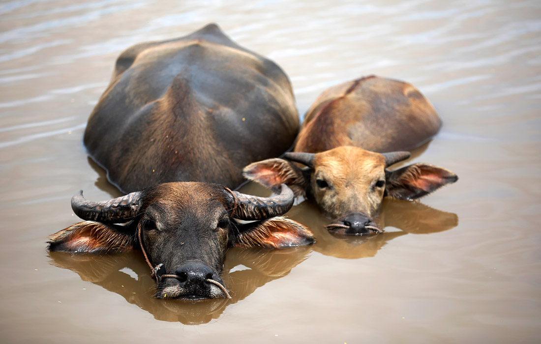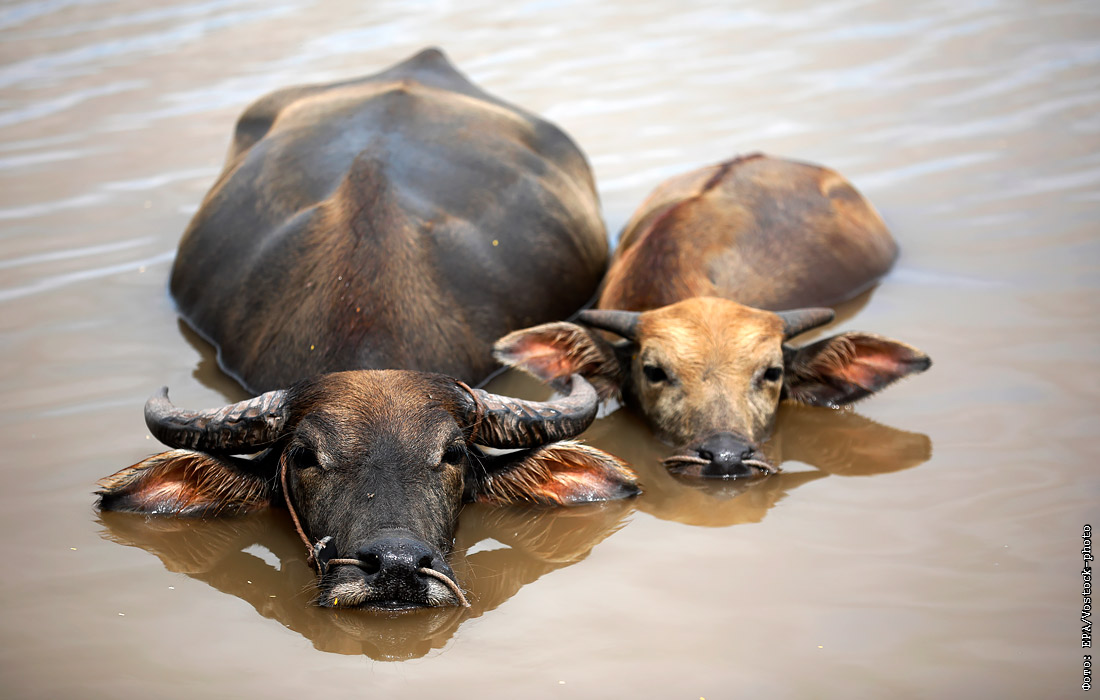 Буйволы спасаются от жары в водоеме. Провинция Намдинь. Вьетнам.