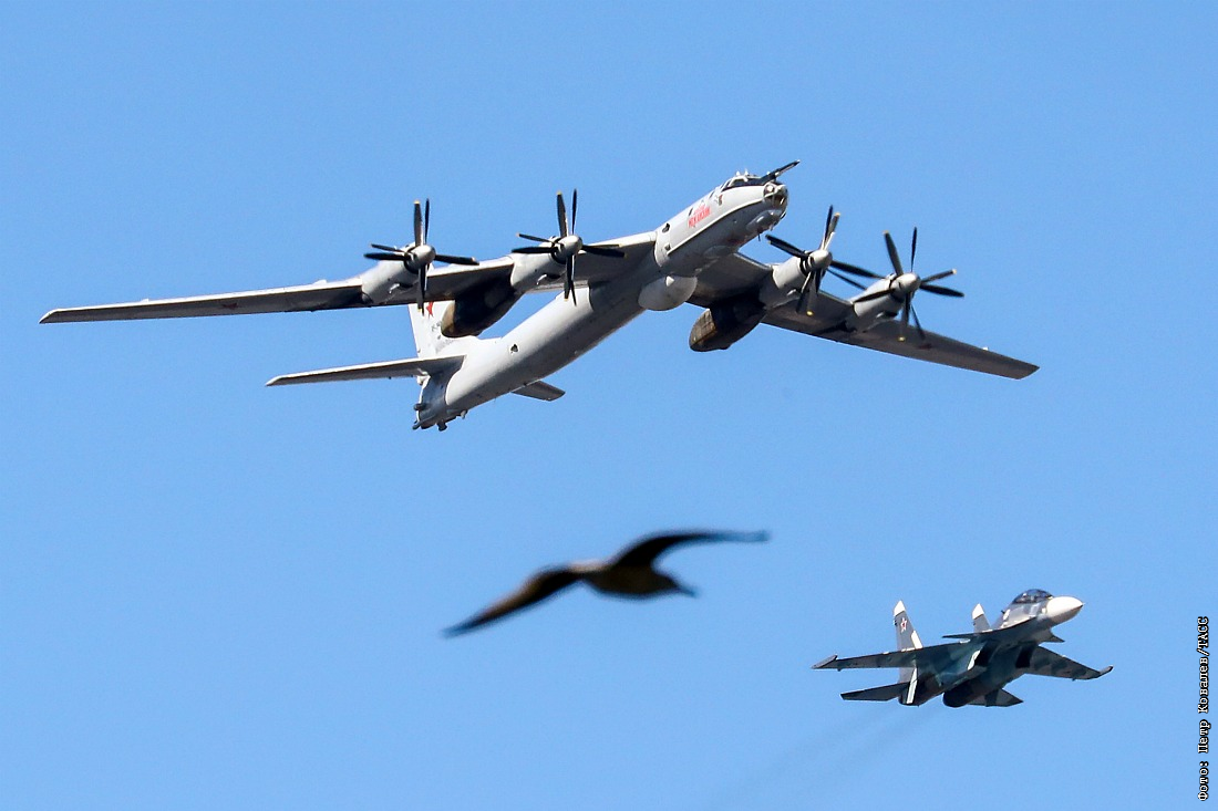 Дальний противолодочный самолет Ту-142 и истребитель Су-33 во время воздушной части парада в Петербурге