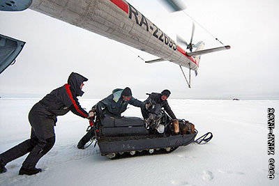 Высадка участников экспедиции на льдину для монтажа станции "Северный полюс-37" в Северном Ледовитом океане