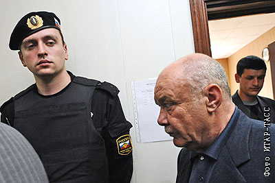 Бизнесмен Сергей Шнайдер (Семен Могилевич) (справа на первом плане), обвиняемый в пособничестве руководителю "Арбат Престижа" Владимиру Некрасову в уклонении от уплаты налогов, в Тушинском суде