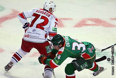 Игроки "Локомотива" Сергей Коньков и "Ак Барса" Дмитрий Обухов (слева направо) в матче чемпионата Континентальной хоккейной лиги: "Ак Барс" (Казань) - "Локомотив" (Ярославль). 3:2