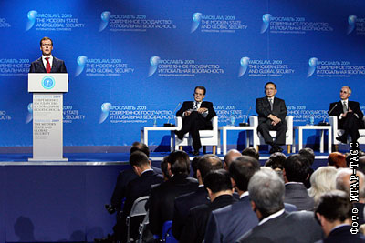 Президент России Дмитрий Медведев (слева) во время выступления на пленарном заседании международной конференции "Современное государство и глобальная безопасность"