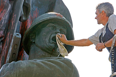 Рабочие муниципалитета в столице Румынии чистят памятник героям Советского Союза Второй мировой войны после того, как он подвергся нападению неизвестных и был варварски залит красной краской