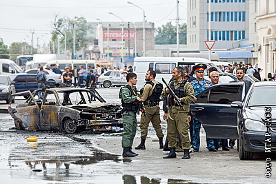 Министр внутренних дел Чечни Руслан Алханов (третий справа) на месте взрыва на пересечении проспекта Путина и проспекта Мира в столице Чечни