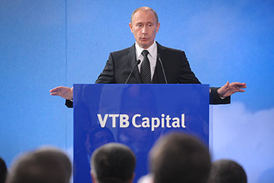 Премьер-министр РФ Владимир Путин во время выступления на инвестиционном форуме ВТБ Капитал "Россия зовет"