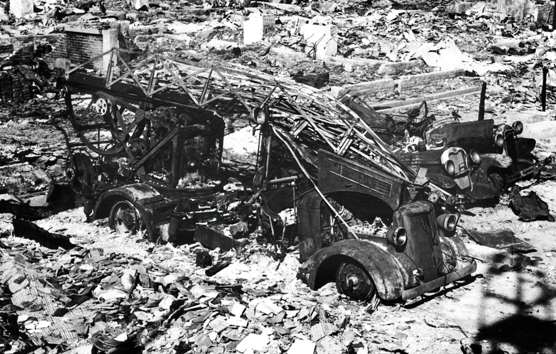 Множество локальных пожаров, возникших в Хиросиме после первого взрыва, объединились в один огромный огненный смерч, образовавший ветер скоростью около 60 км/час. Город был практически стерт с лица земли.