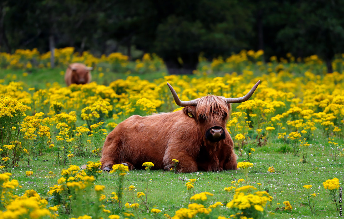 Шотландская корова породы Хайленд на поле в Питлохри, Великобритания