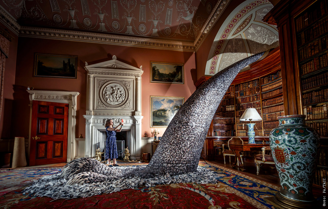 Работа скульптора Кейт Маккгваер из 10 тысяч голубиных перьев в главной библиотеке Харвуд-хаус в Лидсе, Великобритания