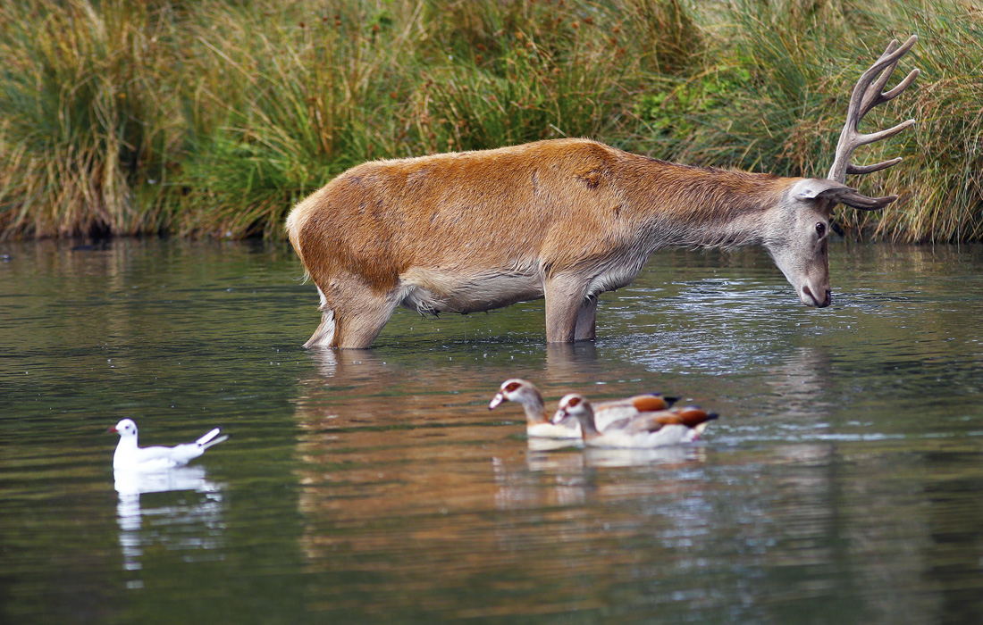 Олень охлаждается в пруду в жаркую погоду в лондонском Ричмонд-парке