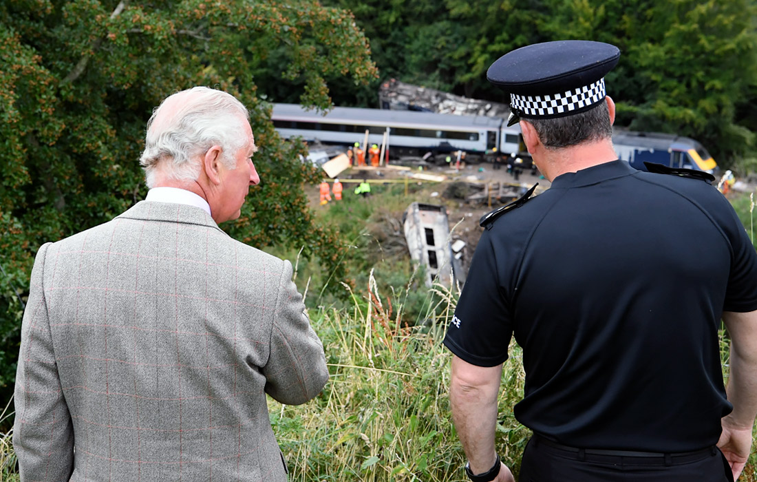 Принц Чарльз посетил место крушения поезда в Шотландии. В среду, 12 августа, пассажирский поезд сошел с рельсов близ города Стоунхейвен в графстве Абердиншир. Три человека, включая машиниста, погибли.