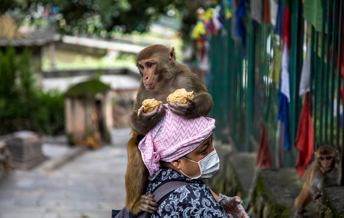 Жительница Катманду подкармливает обезьян на территории закрытого из-за пандемии коронавируса храмового комплекса Сваямбунатх
