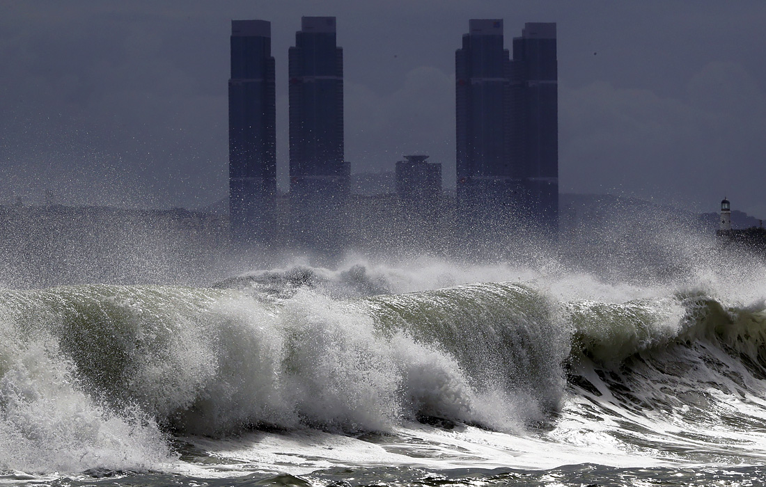 Тайфун "Бави" движется на север вдоль западного побережья Корейского полуострова. На фото: огромные волны на пляже в Пусане.