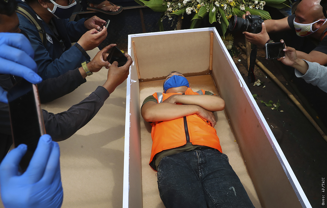 3 сентября. Мужчина лежит в фальшивом гробу в наказание за нарушение правил в индонезийском городе Джакарта. Новые правила требуют от граждан носить маски в общественных местах в качестве меры предосторожности против новой вспышки коронавируса.