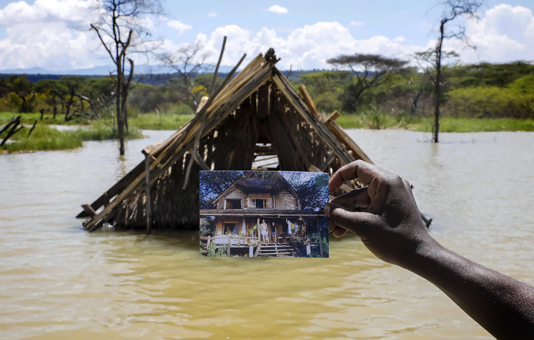 Смотритель показывает фотографию домика до того, как он ушел в воду из-за месяцев необычайно сильных дождей на озере Баринго в Кении