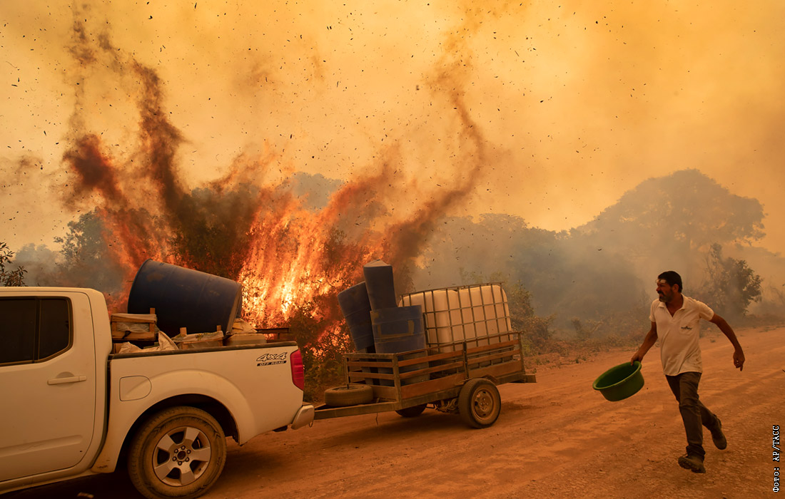 Природные пожары охватили крупнейшее в мире тропическое водно-болотное угодье Пантанал в Бразилии, где обитают тысячи различных видов растений и животных. Ситуация усугубляется самой сильной засухой в стране за последние 47 лет, сильными ветрами и 40-градусной жарой. Пожарные, военнослужащие и добровольцы стараются спасти животных, прежде чем их настигнет пламя.