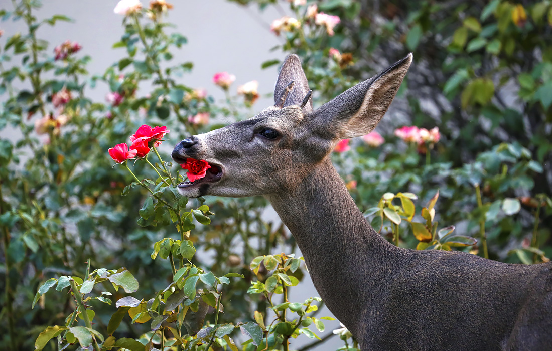 Олень возле дома, жильцы которого были эвакуированы из-за пожара в Аркадии, Калифорния