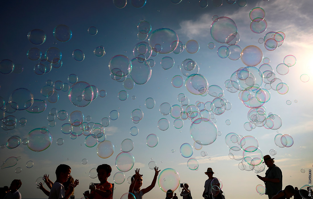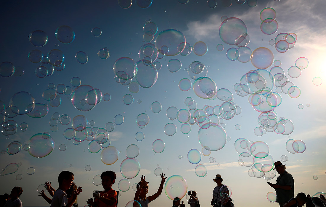 Дети играют с мыльными пузырями в Брайтоне, Великобритания