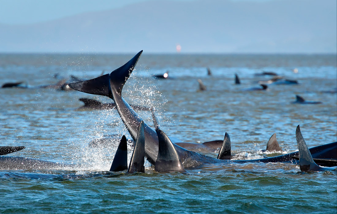 У берегов австралийского острова Тасмания на мелководье застряла стая из более 250 китов-лоцманов