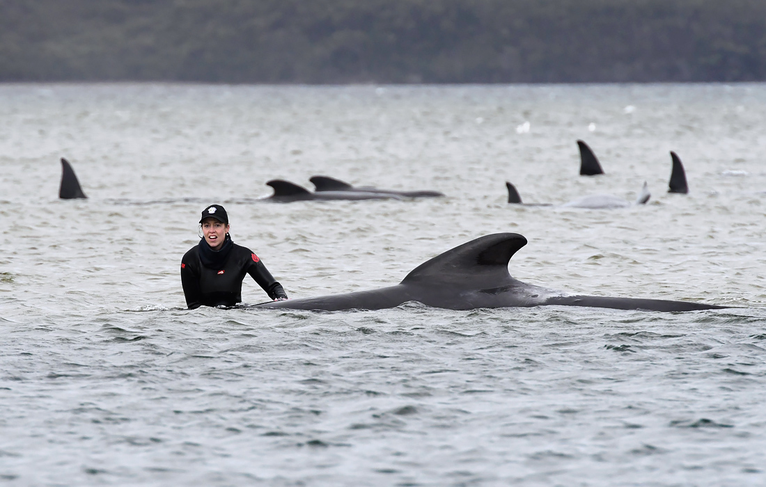 В городке Стран на западе австралийского штата Тасмания развернули масштабную операцию по спасению нескольких сотен черных дельфинов (гринд), которые выбросились на берег