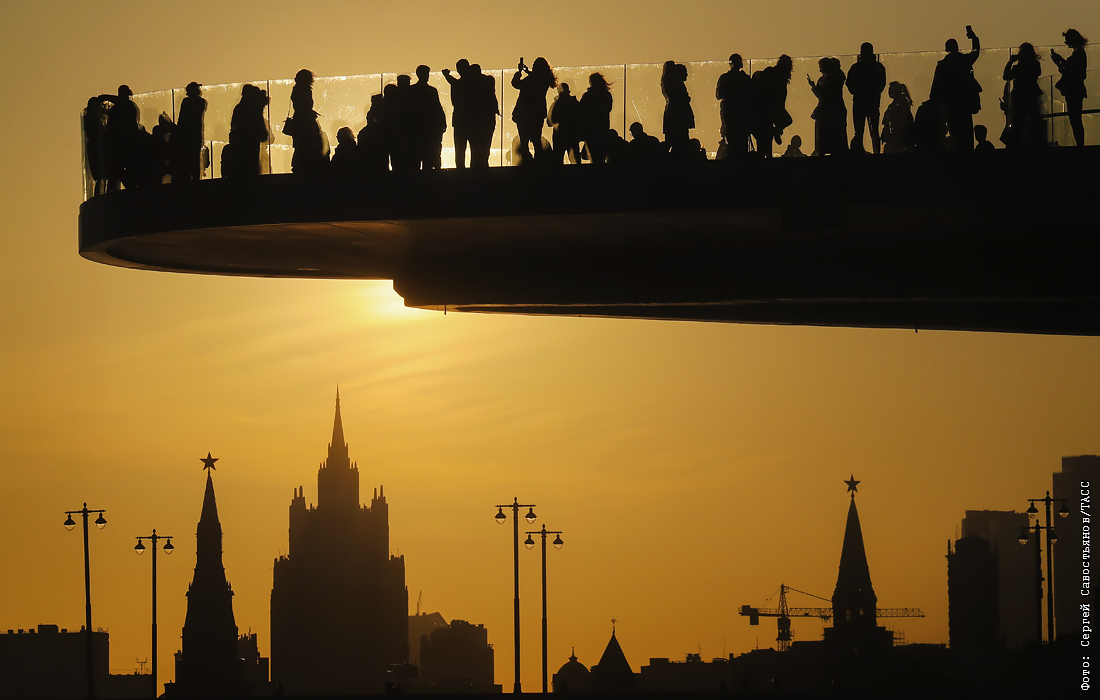 Отдыхающие на парящем мосту в московском парке "Зарядье"