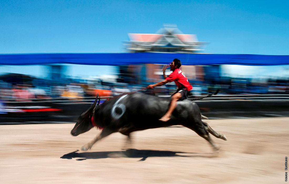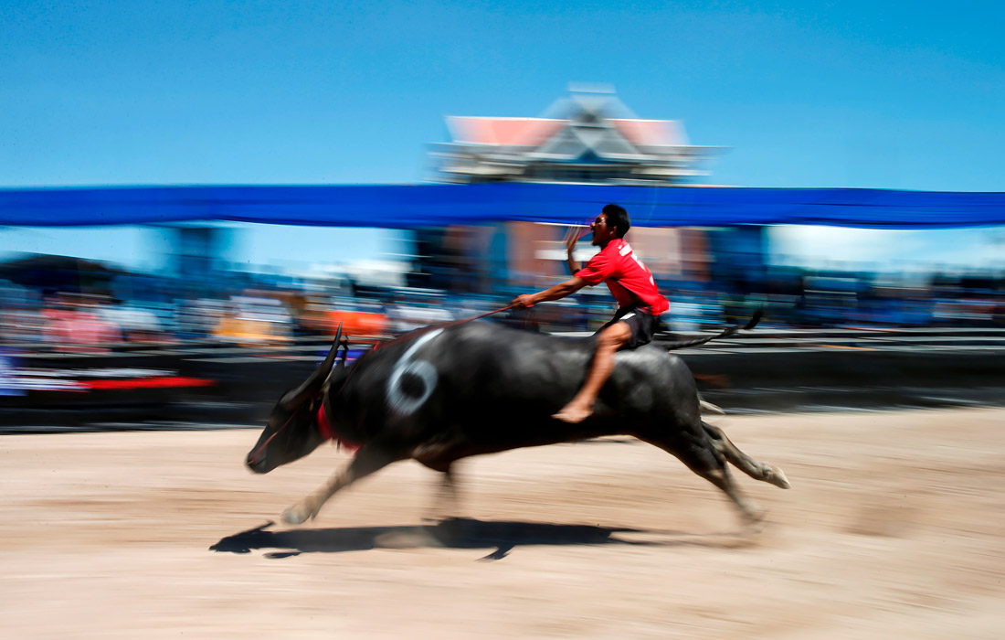 В провинции Чонбури на востоке Таиланда проходят ежегодные гонки на буйволах. Удержаться на несущихся буйволах без седла непросто, поэтому финишную линию пересекают далеко не все погонщики.