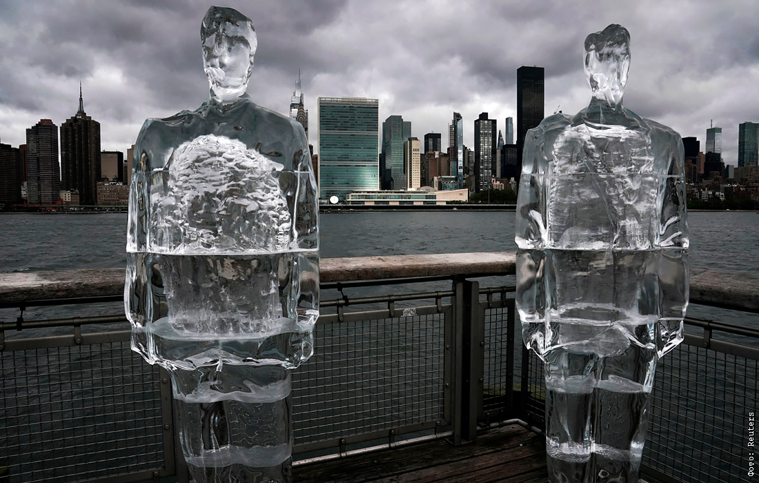 Ледяные скульптуры, изображающие президента США и президента Бразилии, в Нью-Йорке