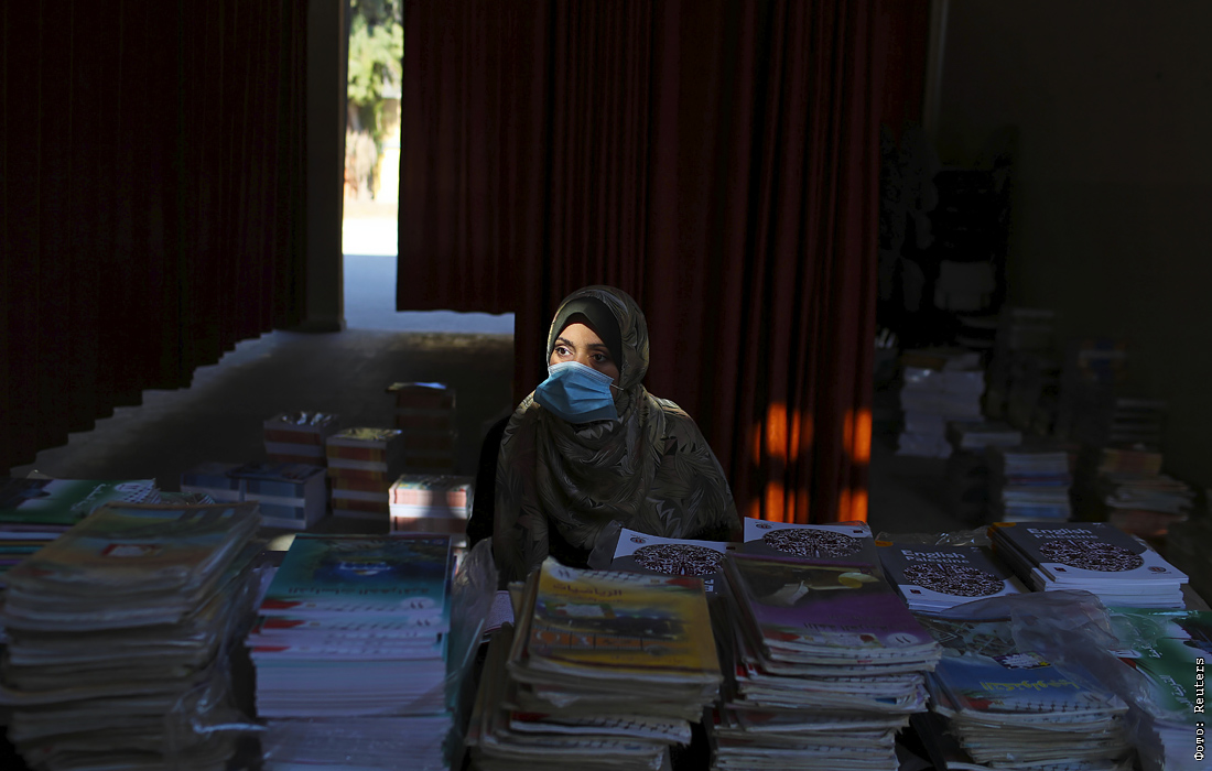 Министерство образования Палестины начало подготовку к открытию школ в условиях вспышки коронавируса. На фото: учительница раздает книги ученикам в школе на севере сектора Газа.