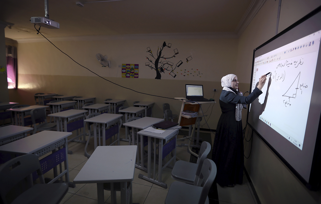 Учитель частной школы проводит онлайн-урок для студентов, получающих дистанционное образование, на фоне опасений роста числа случаев COVID-19 в Аммане, Иордания