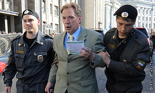 Задержание участника акции протеста против принятия поправок, ужесточающих ответственность за проведение несанкционированных уличных акций, у здания Госдумы РФ.