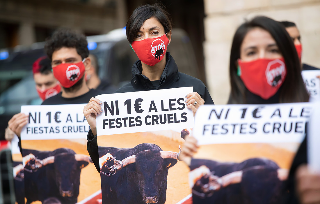 Несколько активистов группы по защите прав животных AnimaNaturalis вышли на протест против забега быков в Барселоне