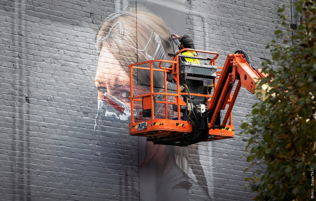 Художник Питер Барбер рисует граффити для Национальной портретной галереи в Манчестере