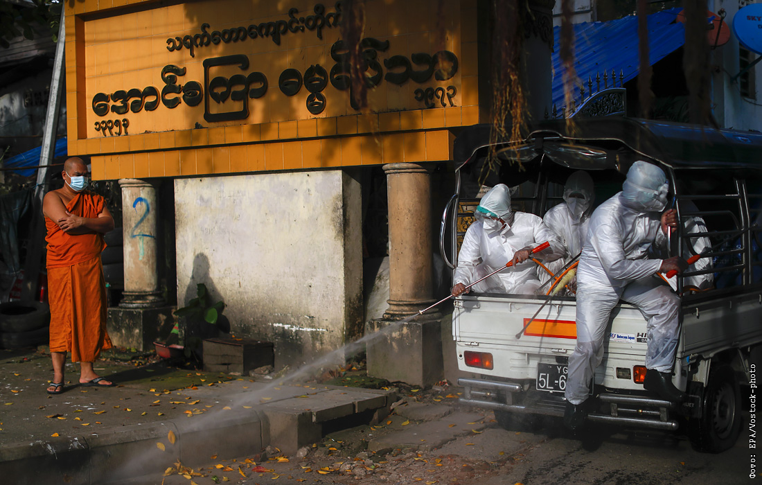 Добровольцы вступают в борьбу с пандемией COVID-19 в Мьянме, поскольку медицинские работники перегружены. На фото: буддийский монах наблюдает, как добровольцы из городской благотворительной группы We Love Lanmadaw дезинфицируют территорию.