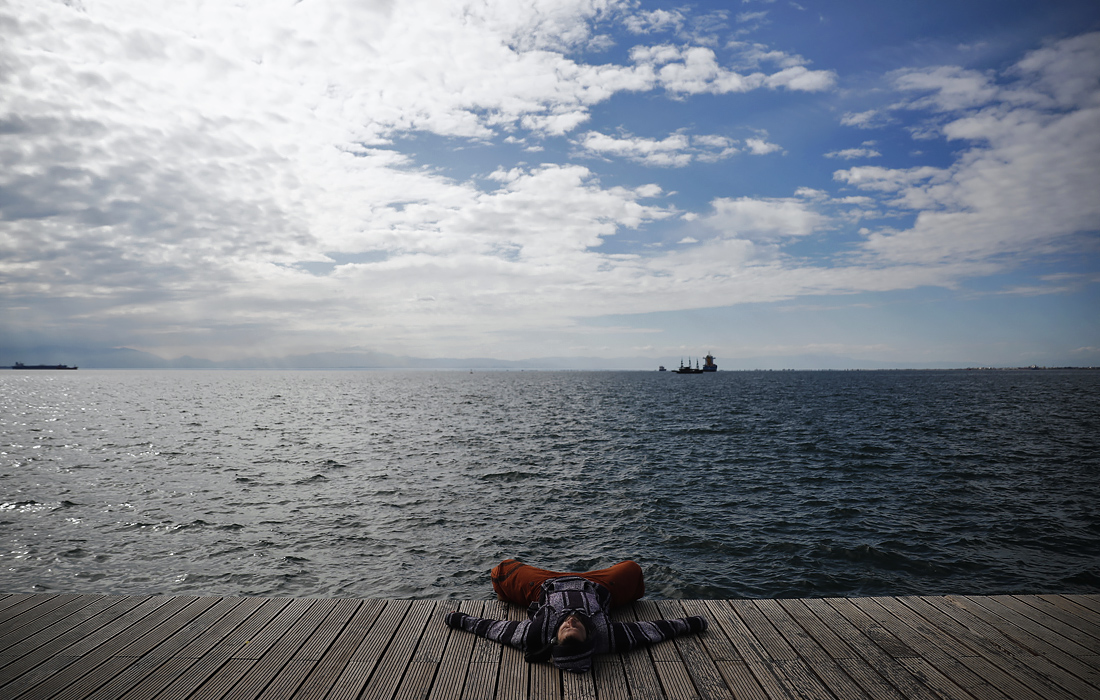 Мужчина отдыхает на берегу моря в северном греческом городе Салоники