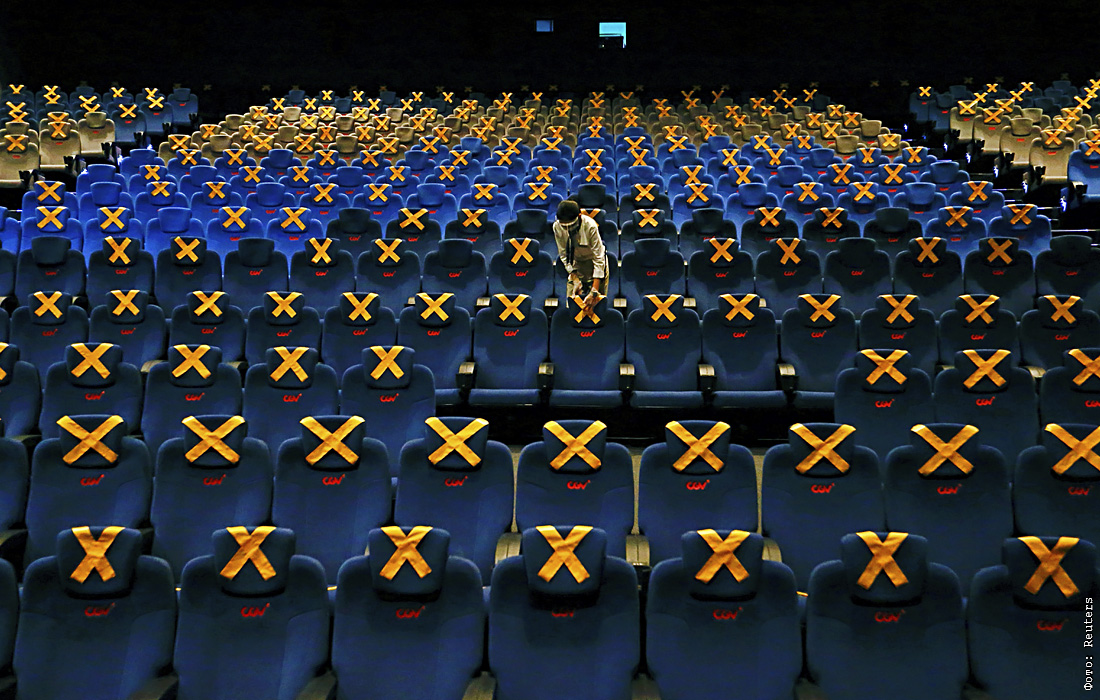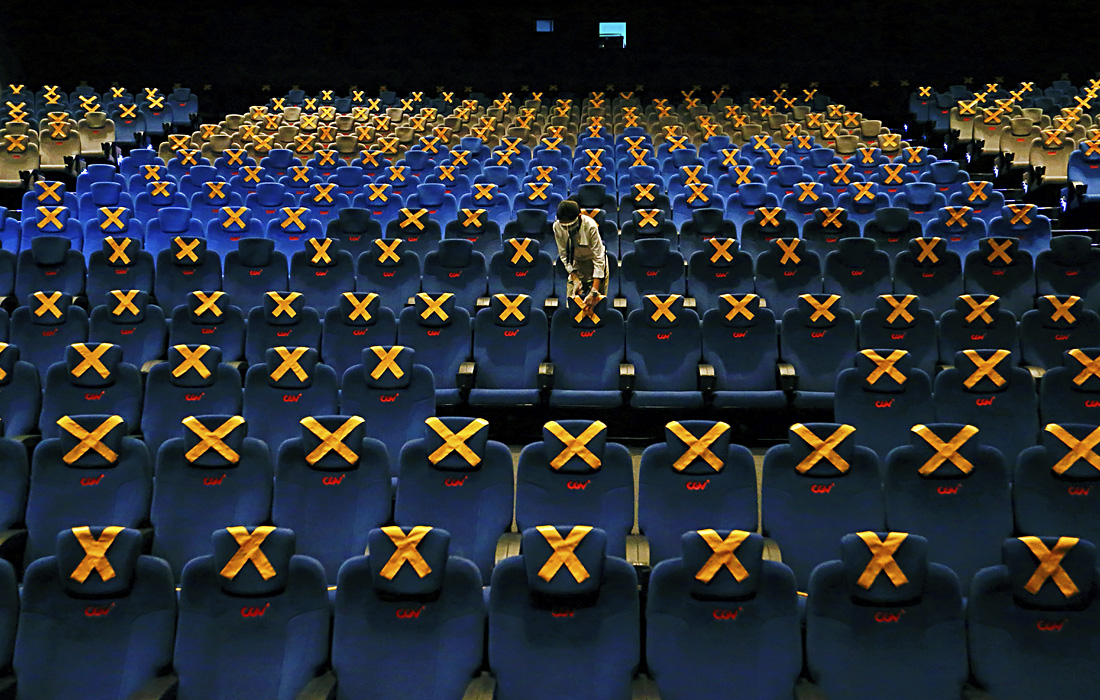 Сотрудник кинотеатра отметил места для социального дистанцирования из-за высокого уровня заражения на фоне пандемии COVID-19 в Джакарте
