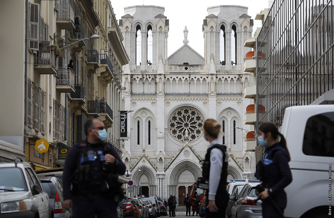 В Ницце вооруженный ножом радикализированный мусульманин напал на людей в церкви Нотр-Дам. Три человека погибли, один из них, по данным СМИ, был обезглавлен. Нападавший госпитализирован. Похожий инцидент произошел близ Парижа, когда мужчина чеченского происхождения обезглавил преподавателя, показавшего ученикам карикатуры на пророка Мухаммеда из журнала Charlie Hebdo. Власти Ниццы приняли решение на время закрыть все христианские церкви и другие связанные с религией места.