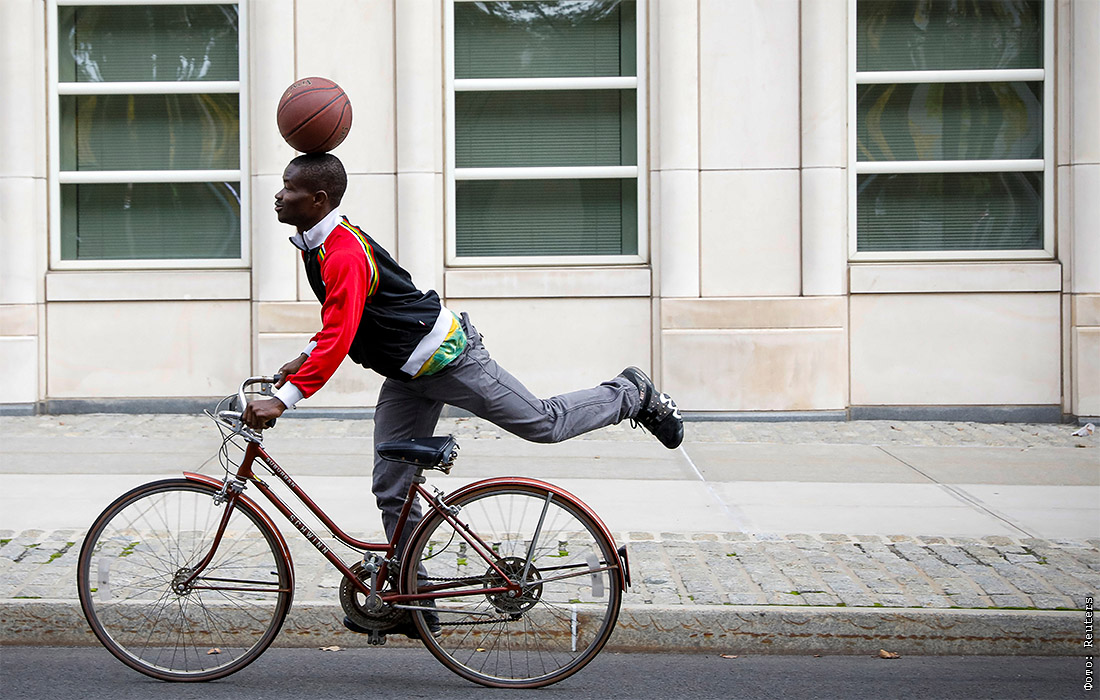 Мужчина катается на велосипеде в Нью-Йорке