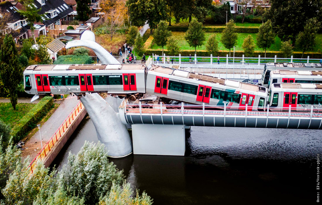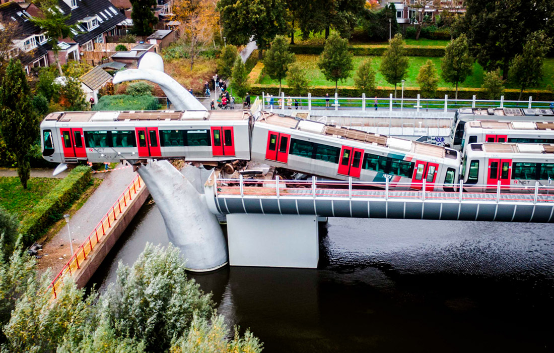 В пригороде Роттердама машинист метро потерял управление, поезд пробил ограждение станции и застрял на высоте десяти метров над каналом, зацепившись за фрагмент скульптуры в виде хвостов китов.