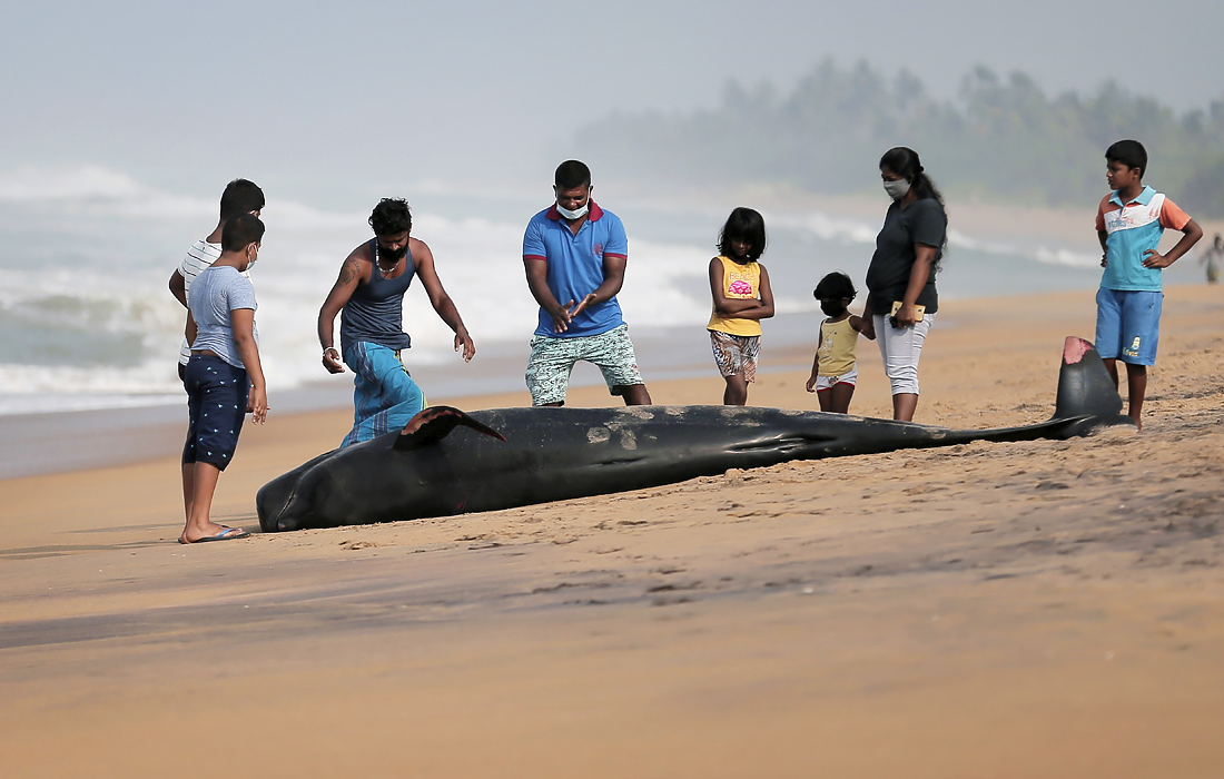 В Шри-Ланке на берег массово выбросились гринды. Береговой охране и волонтерам удалось спасти 120 животных, однако две раненые особи погибли.