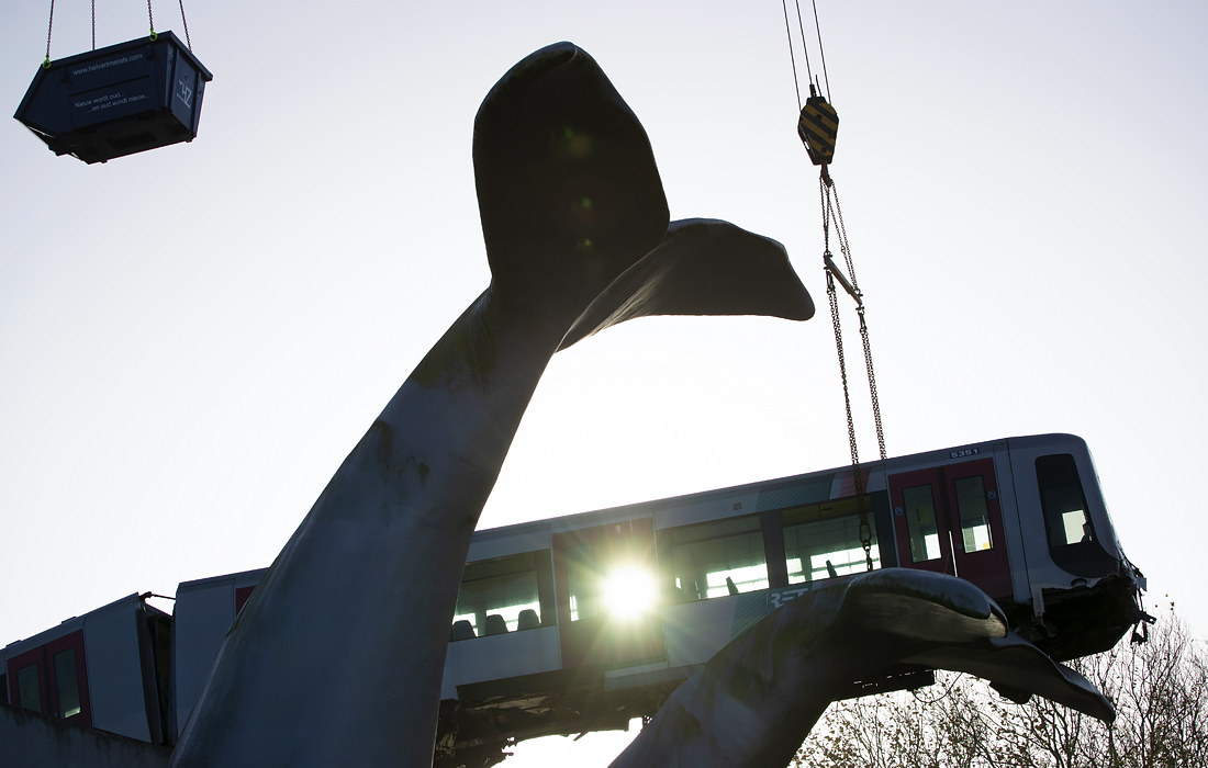 В пригороде Роттердама Спейкениссе снимают со статуи поезд метро, который в ночь на понедельник пробил ограждение станции и повис на десятиметровой высоте