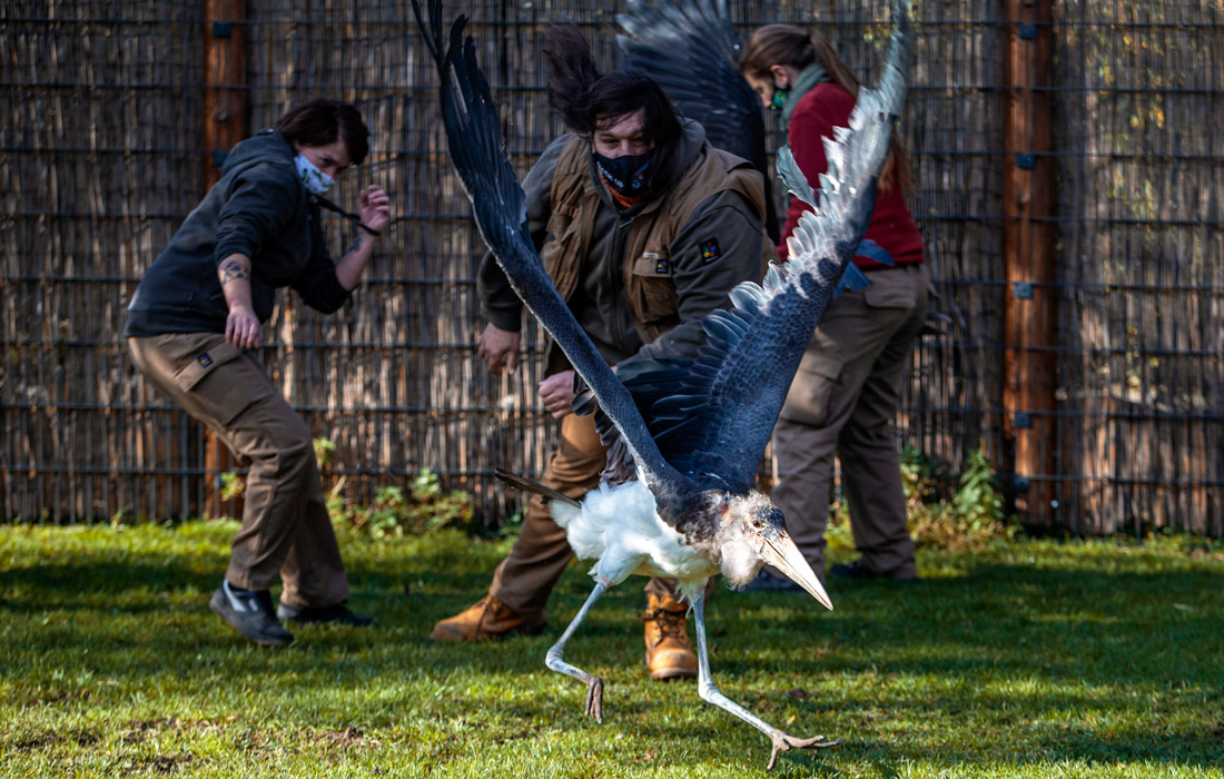 Смотрители Пражского зоопарка ловят аиста марабу, чтобы переместить его в зимний вольер