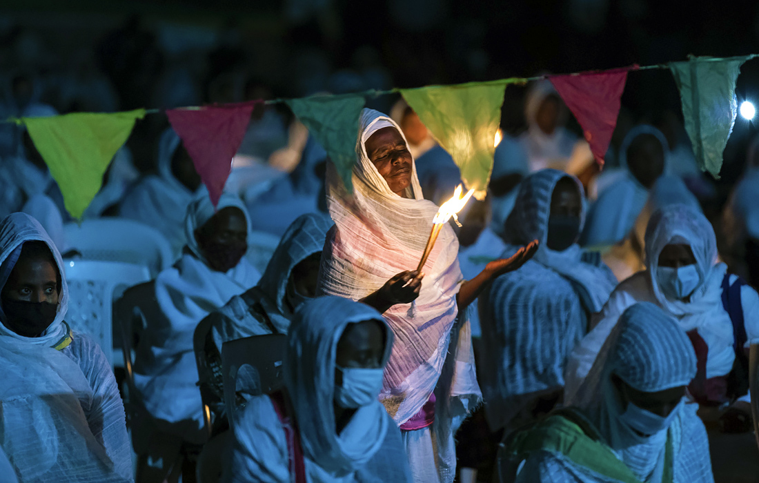 Эфиопские христиане во время церковной службы в соборе Аддис-Абебы, Эфиопия